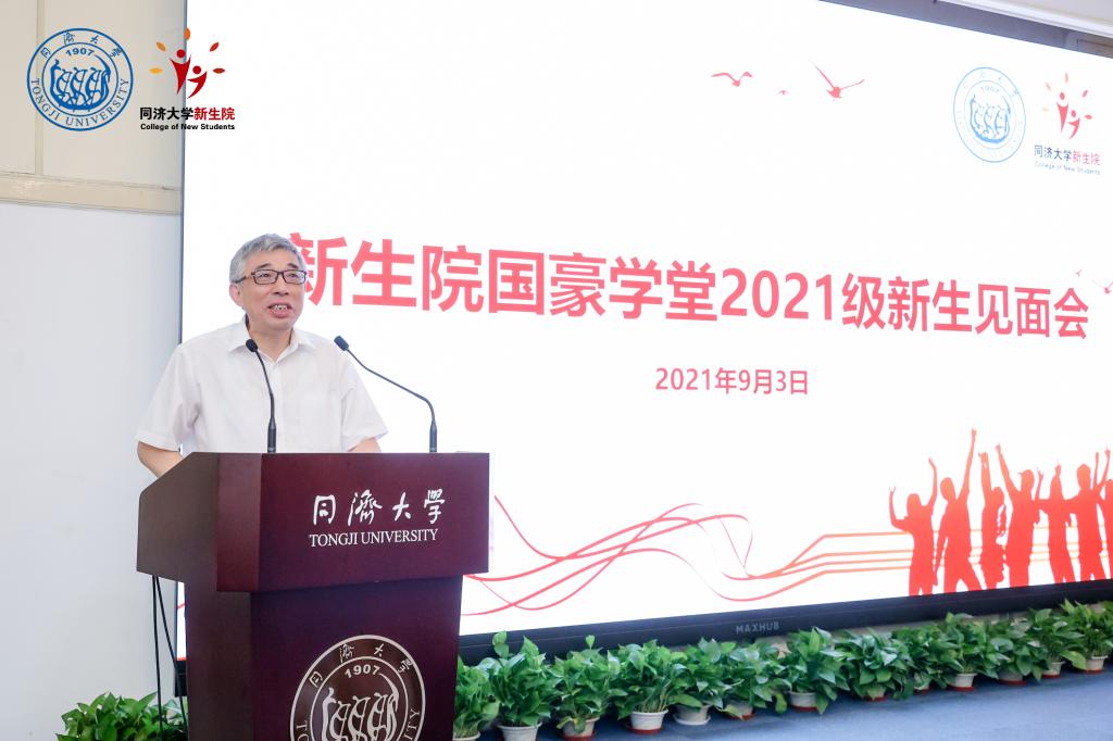 9月3日上午,同济大学新生院国豪学堂举行2021级新生见面会,119名学子光荣加入国豪学堂。校长陈杰出席并讲话,副校长顾祥林主持。来自土木工程学院、航空航天与力学学院、化学科学与工程学院、交通运输工程学院、生命科学与技术学院、建筑与城市规划学院、海洋与地球科学学院等全校15个专业学院的负责人,以及新生院专兼职辅导员、班主任们参会。