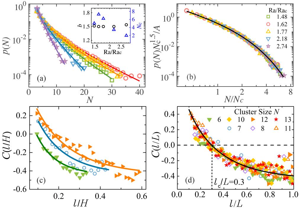 为了进一步揭开旋涡反离心运动之谜,研究人员对旋涡运动的关联性进行了统计分析。实验与数值模拟的数据都表明,由于对流旋涡之间的流体相互作用,临近旋涡的运动表现出相似性和长程关联性。当旋涡处于密集分布状态时,旋涡自发地形成旋涡团块后,以集群的形式发生整体的径向运动 (图1b)。基于这些重要的发现,研究人员阐明了旋涡反离心运动的内在机理:当旋涡以发生集群运动时,团块中在强度和数量上都占有优势的冷涡主导了团块的运动方向,驱动热涡向外的径向运动。